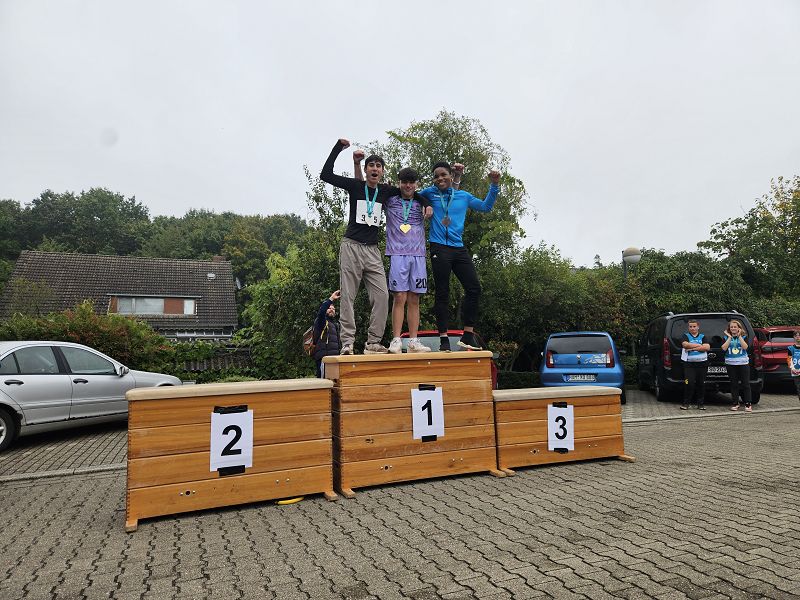 Im Hauptlauf, dem 3-Kilometer-Lauf der Jungen und Jugendlichen, erzielte Felix einen herausragenden ersten Platz. Mit Abstand dahinter folgte Joan, der sich den zweiten Platz sichern konnte – ein großartiger Doppelerfolg für unsere Schule!
